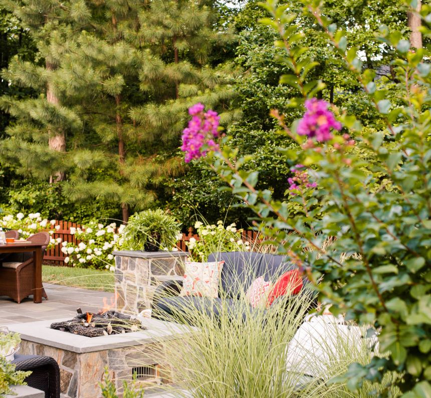 The final space is a stunning extension of the house and features a mortared-bluestone patio, grill island, gas fire pit, sitting walls and outdoor lighting. The project also includes comprehensive landscaping of the front and backyard.
