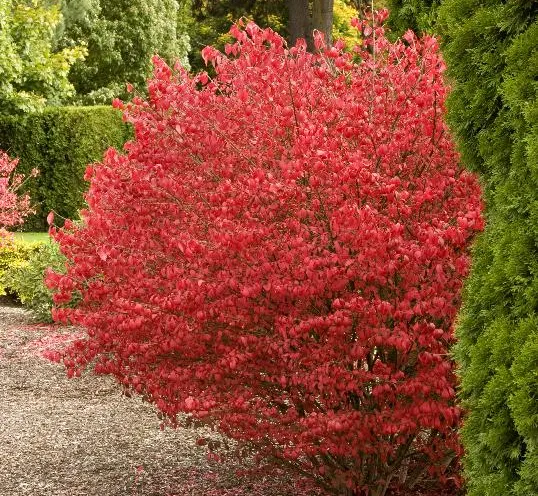 Pictured: When it comes to shrubs, Burning Bush is an all-time favorite for adding fall interest. They are essentially the maple tree of fall shrubs.