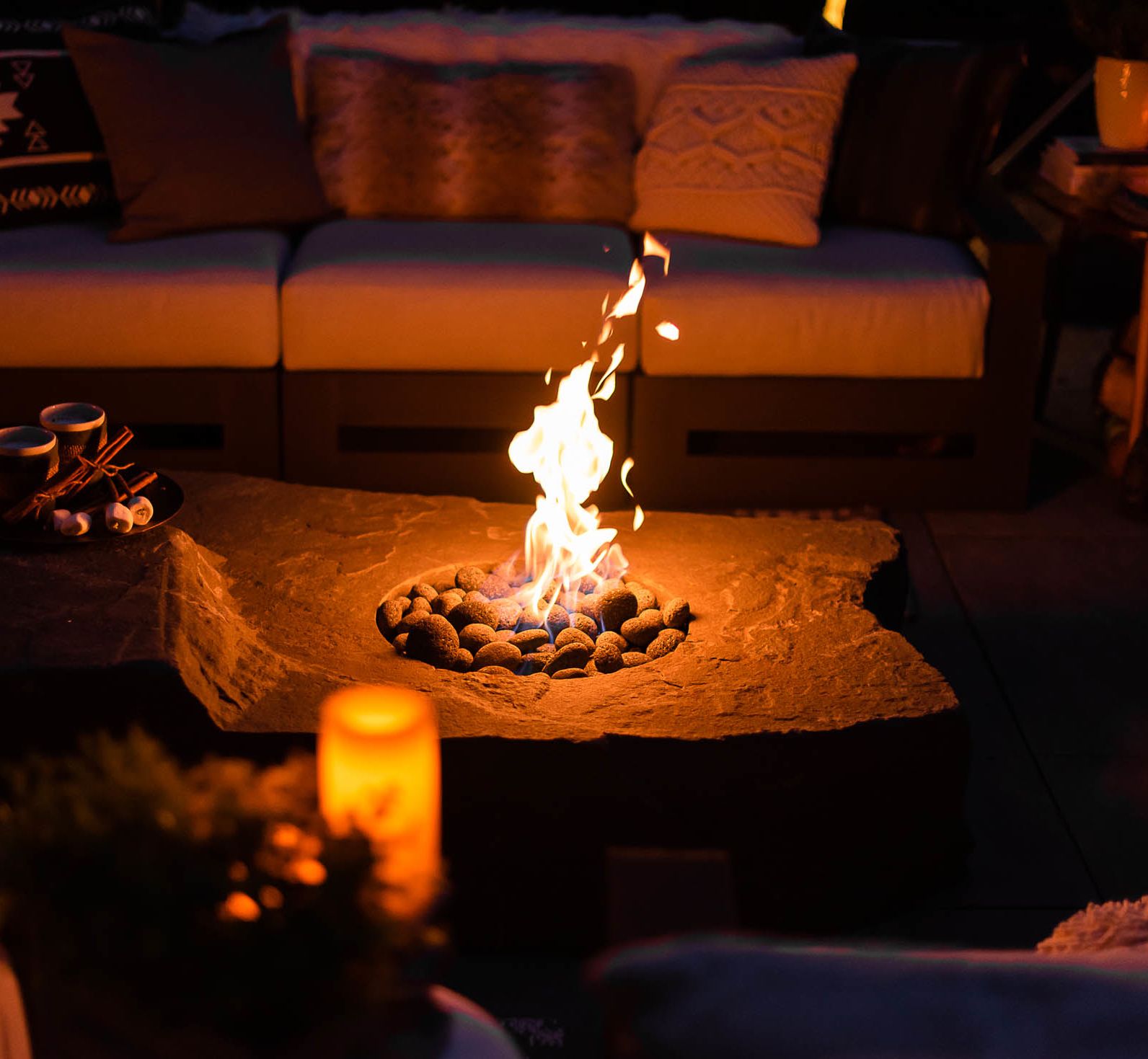 Most notably, fire features create the opportunity to toast marshmallows, create s'mores, and sip on hot chocolate. Consider elevating these treats with higher-end ingredients and adding elements you might not consider if your kids were involved (fruit, dark chocolate, a drizzle of Bailey's, etc.).