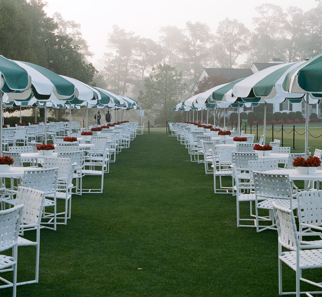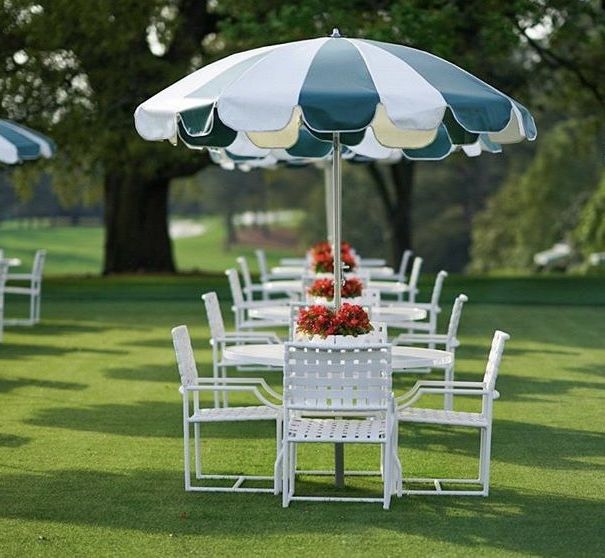 When it comes to furnishing your Masters-themed outdoor space, this picture of Augusta's patio area is all you need for inspiration. From the white-framed furniture to the green and white striped umbrella, this picture says it all. When you're selecting furniture, fabrics, and accessories, do not diverge from green and white.