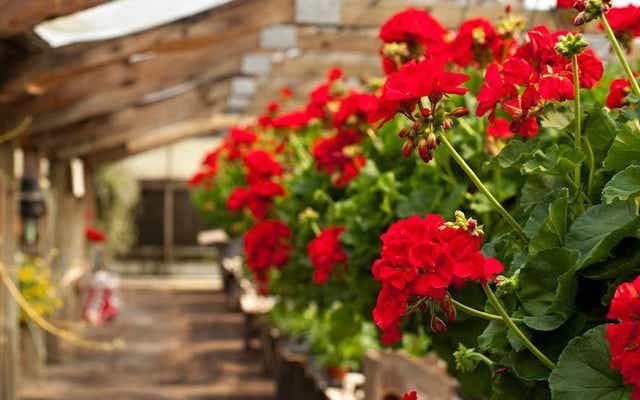 Hanging baskets of red geraniums can be found at the entrance and throughout the Augusta National Clubhouse.