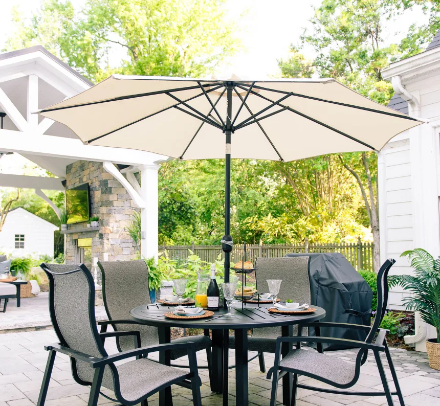 Whether incorporated with a dining table or cantilevered over a lounge area, umbrellas are a reliable and versatile source of shade.
