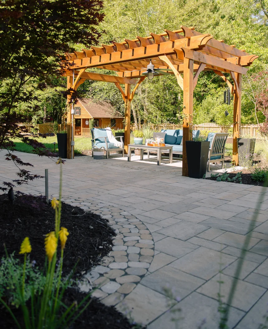 Shade is one of the most important and often overlooked elements when designing an outdoor living space. Though it doesn't actually lower the temperature, science shows that shade makes the air feel 10-15 degrees cooler. During the hot summer months, even the most sun-loving individuals need the occasional break from the heat. Without a shady reprieve, individuals will retreat inside to escape the heat.