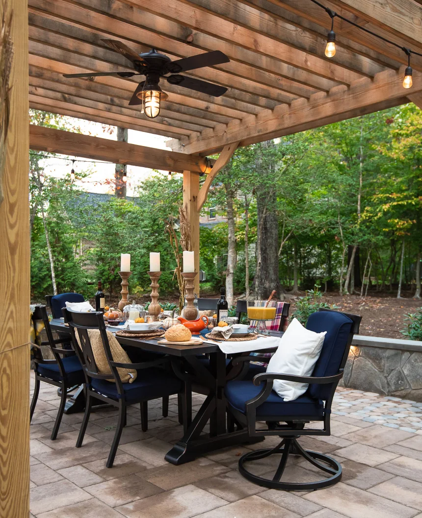 As temperatures begin to drop and insects die off, outdoor dining becomes even more inviting. When designing your outdoor living space, be sure to plan plenty of room for dining. If entertaining larger groups is a possibility, be sure to incorporate extra space for large or multiple tables that might be needed outside of everyday use.
