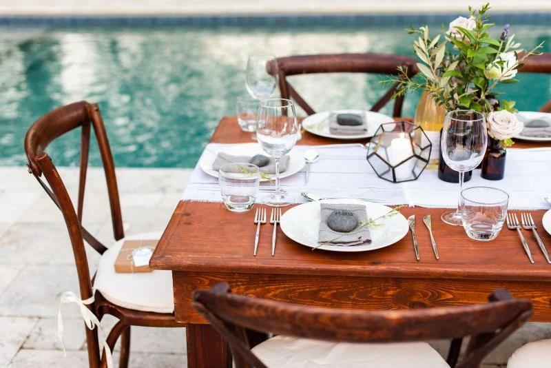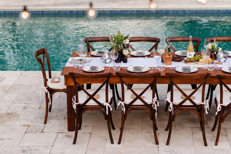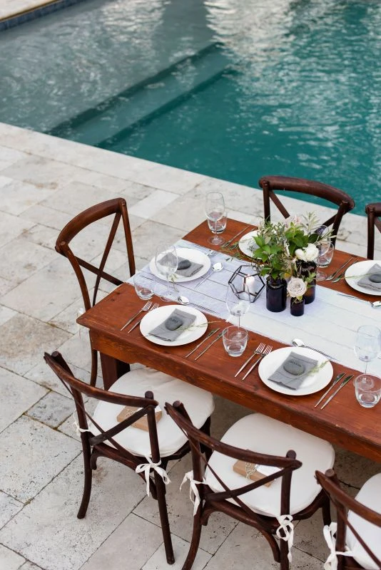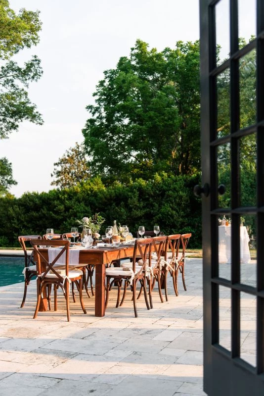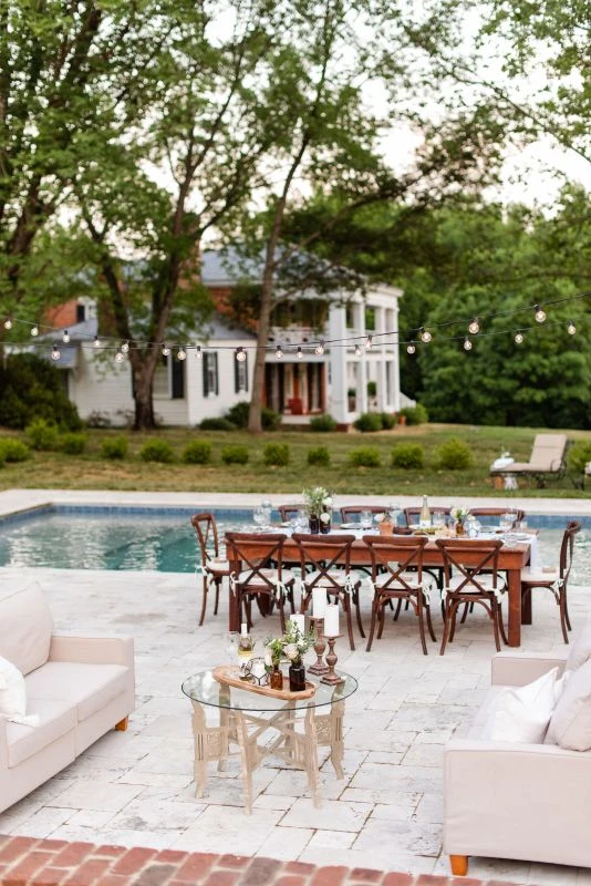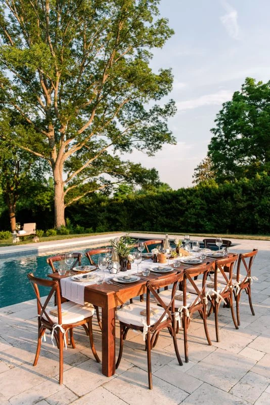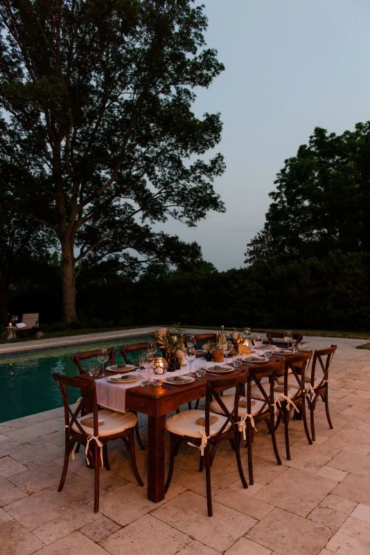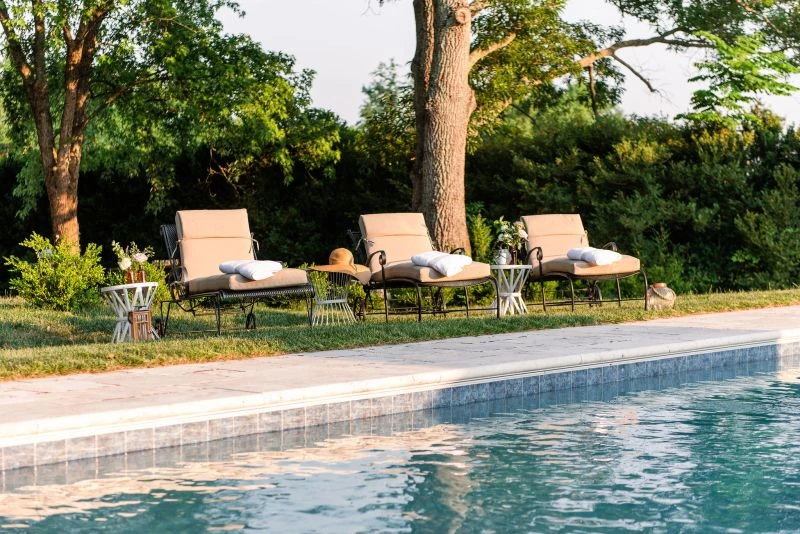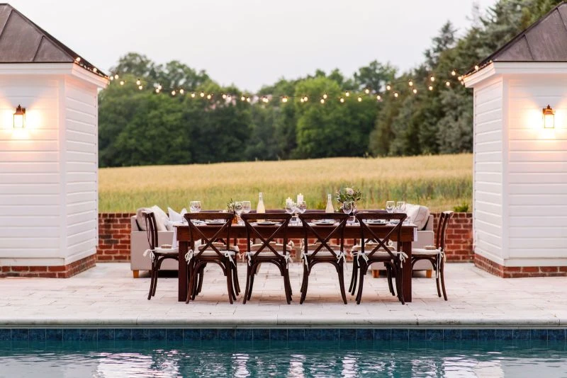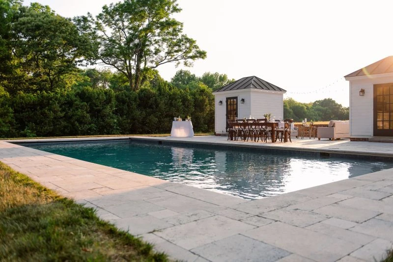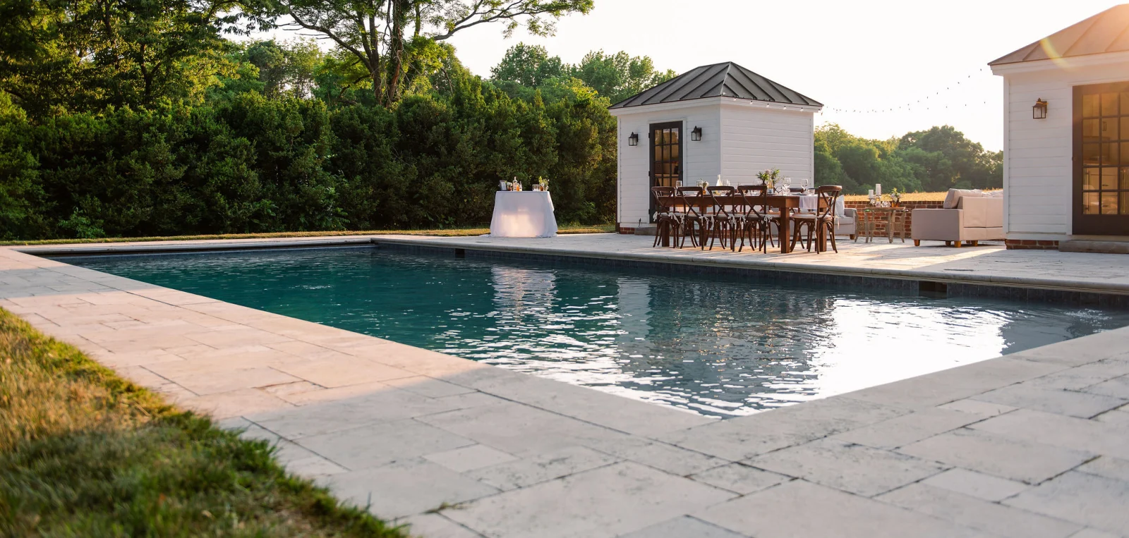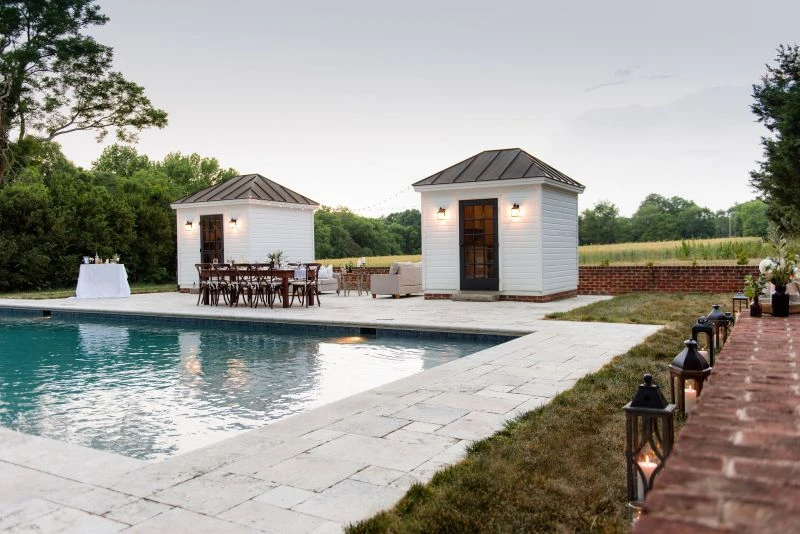This project features a stunning 20x42' gunite pool with an automatic cover, expansive pool decking, and two cabanas from Hillbrook Collections. Both the pool coping and pool decking are Grano travertine from Marmiro Stone. Additionally, to control the slope and create a flat area, brick walls were built to wrap half of the space. To match the architecture of the historic home, handmade brick from Cushwa was used for these walls.
