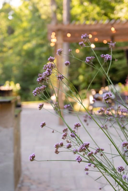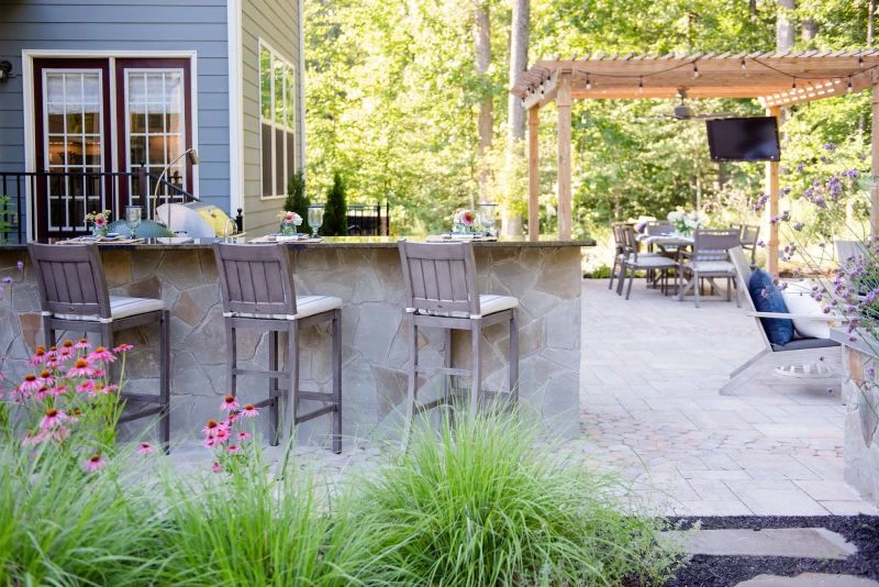 This wonderful client came to Outdoor Dreams looking for an area to entertain family and friends. Their outdoor living space includes a wood-burning fire pit, pergola-covered dining area, masonry stairs, bench-style sitting walls, hot tub, television, and an expansive outdoor kitchen. The patio is composed of BLU 60 slabs from Techo-Bloc and includes a unique inlay of Antika pavers. The masonry structures feature split face veneer using colonial wall stone. The expansive outdoor kitchen features a gas grill, egg smoker, grill lamp, sink, refrigerator, trash drawer, and bar-top seating. The hardscape structures are complemented by the expansive landscape and outdoor lighting. Whether entertaining a group or casual evening watching sports on the television, the homeowners use this space almost every day.