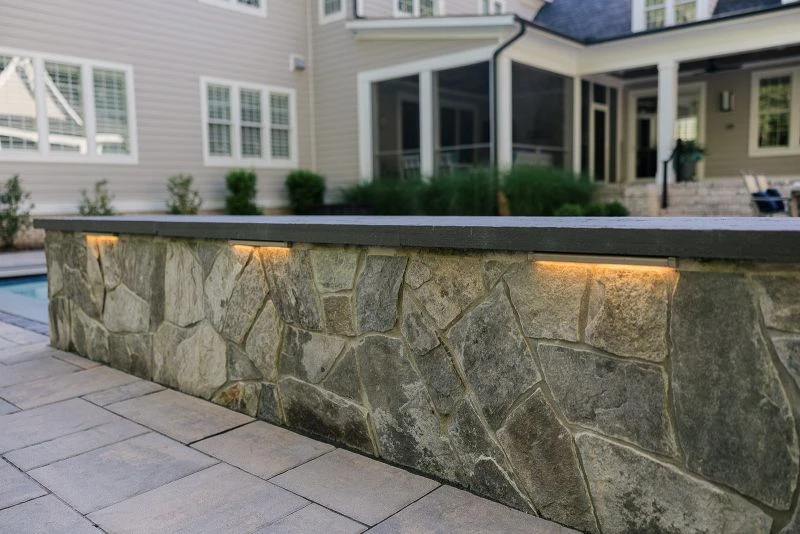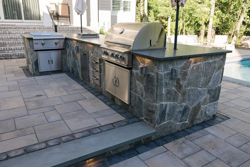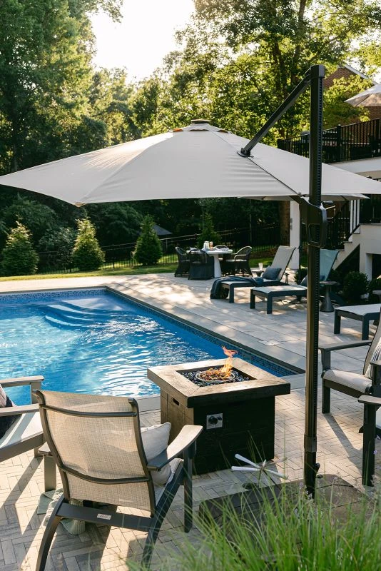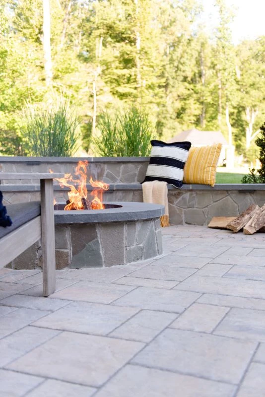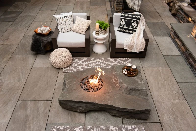 massive grey gas-burning fire pit between beautiful outdoor chairs