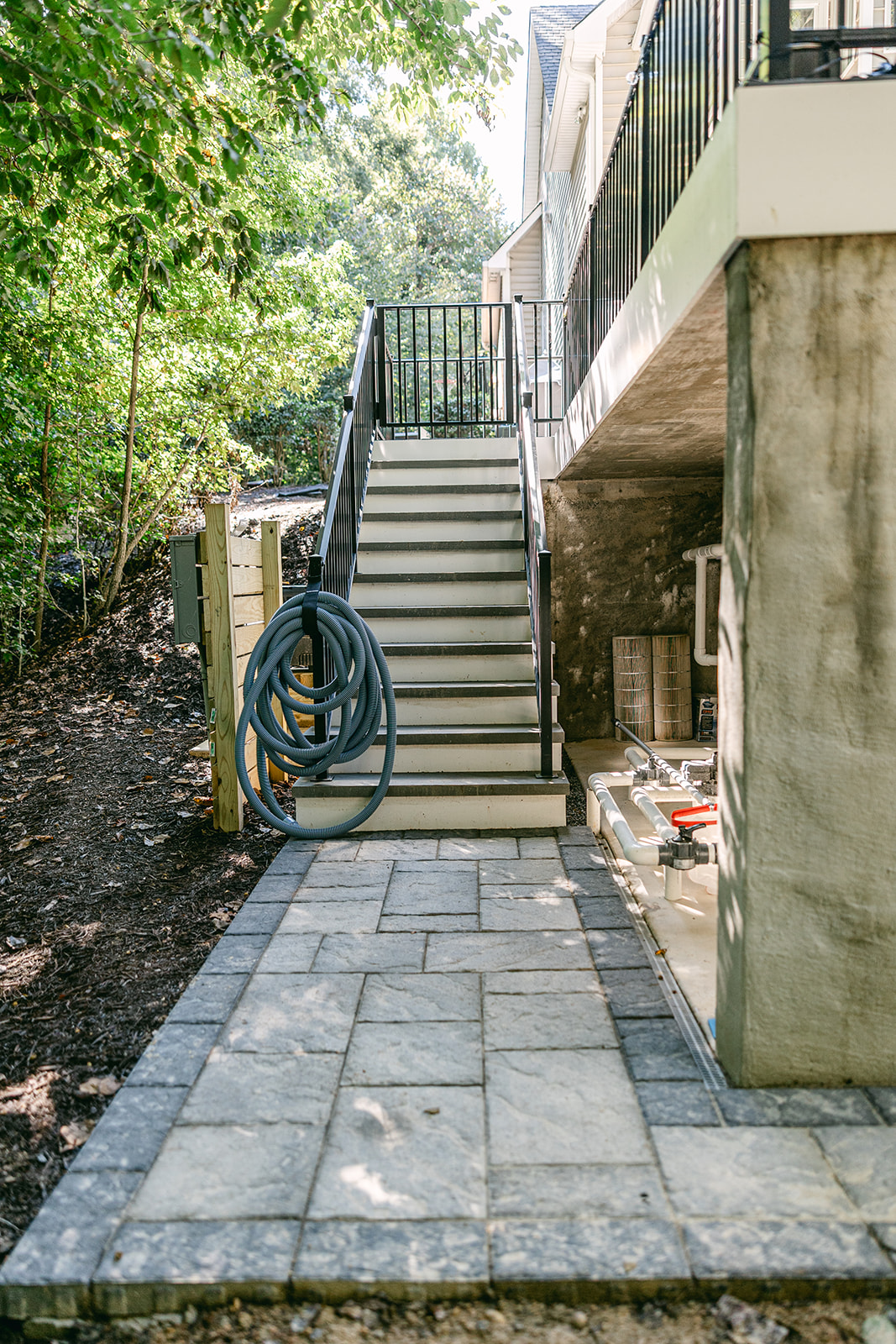 One of the project’s most innovative details lies beneath the surface: both sides of the pool deck were framed, rebarred, and shot in gunite together with the pool shell, allowing the creation of an integrated equipment cubby (or “equipment cave,” as our team likes to call it). This clever nook conceals all the pool equipment while keeping it close to the pool for maximum efficiency, accessibility, and performance. It’s the kind of behind-the-scenes detail that makes a big difference in how the space functions long-term.