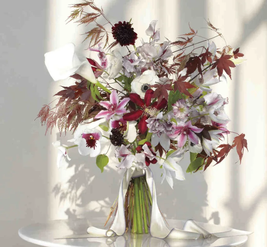 Picture: Stems of Japanese Maple elevate this bouquet of Clematis and Anemone flowers