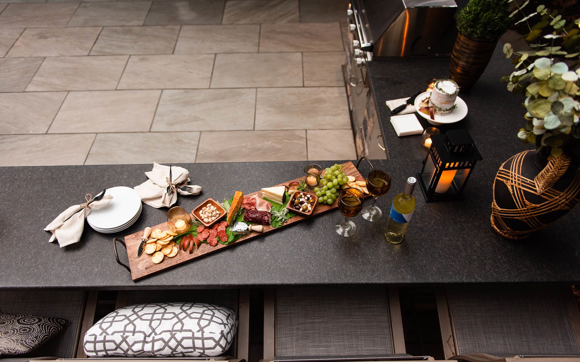 Along with the fireplace, one of the clients' "must-have" features was an outdoor kitchen. Including a built-in grill, rotisserie and hidden trash can, this structure also features an expansive area for bar-top seating. To elevate this structure into a stunning feature, an upgraded granite (Silver Pearl with a Honed Finish) was selected.