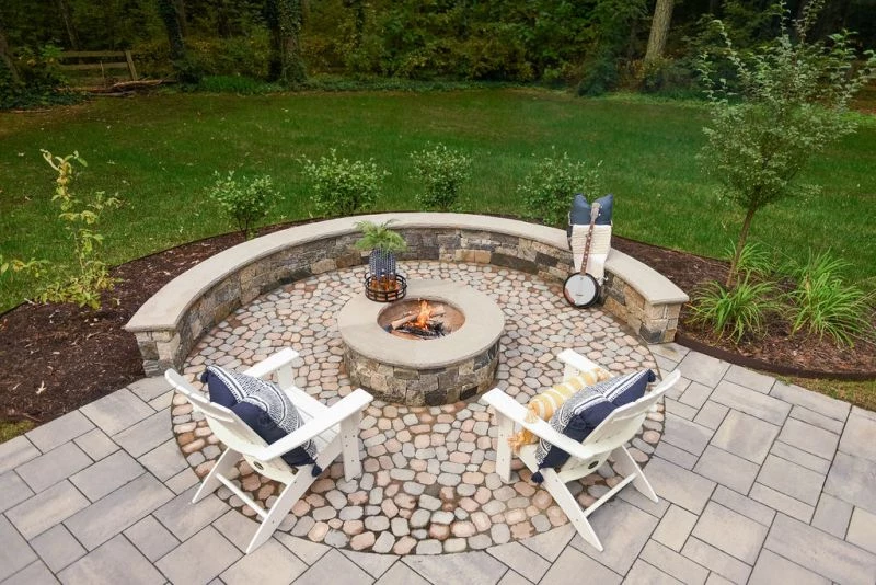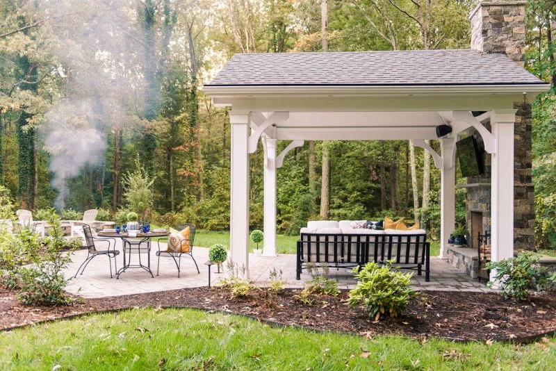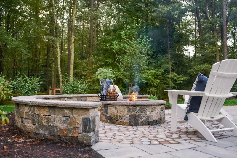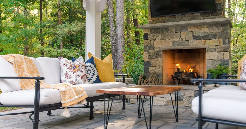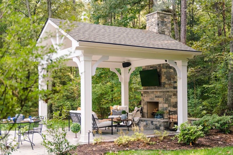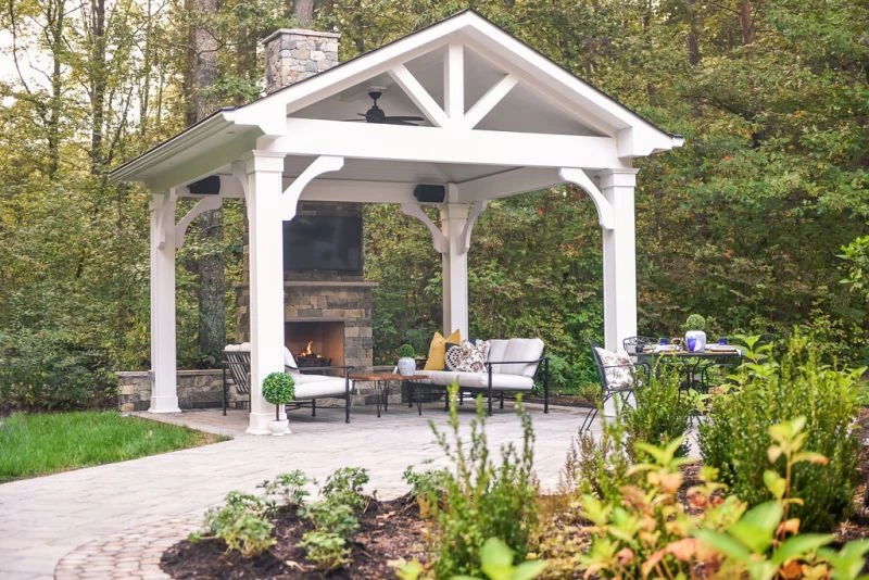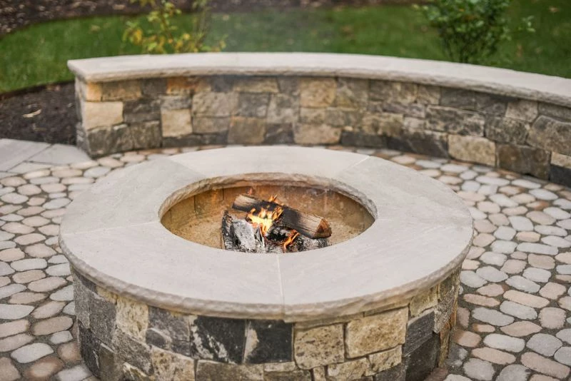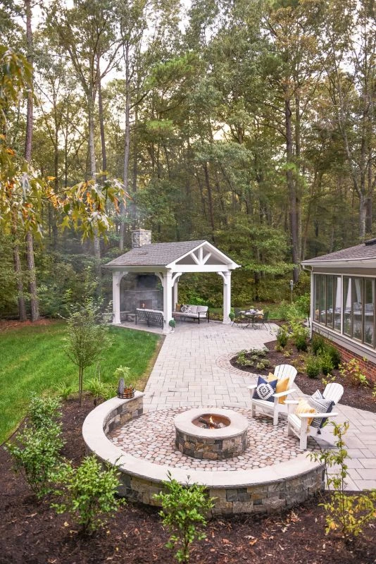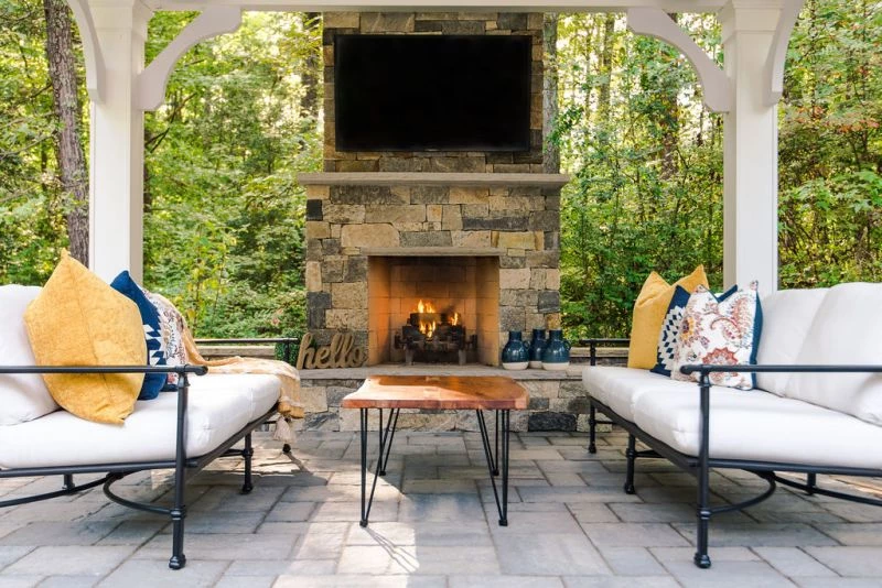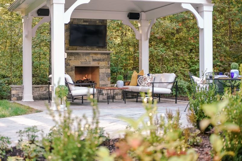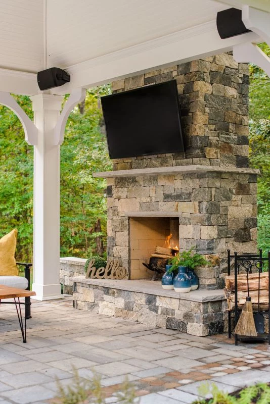 With two fire features and a hot tub, this is the perfect space for Autumn evenings with family and friends. Along with the wood-burning fire pit and fireplace, this beautiful space also features a custom pavilion with low-maintenance finishes and a patio composed of BLU 60 slabs and Antika pavers from Techo-Bloc. The stunning masonry work is softened by the surrounding landscape that incorporates a unique mix of low-maintenance plants. To complete the outdoor room, the fireplace has been outfitted with a SunBrite outdoor television that is perfect for family movie nights and game day gatherings.