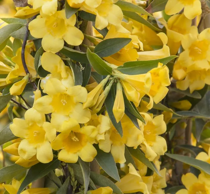 Gelsemium sempervirens is a twining vine native to the Southeast. This semi-evergreen vine produces 1.5-inch bright yellow trumpet flowers during the first warmth in February through late March.