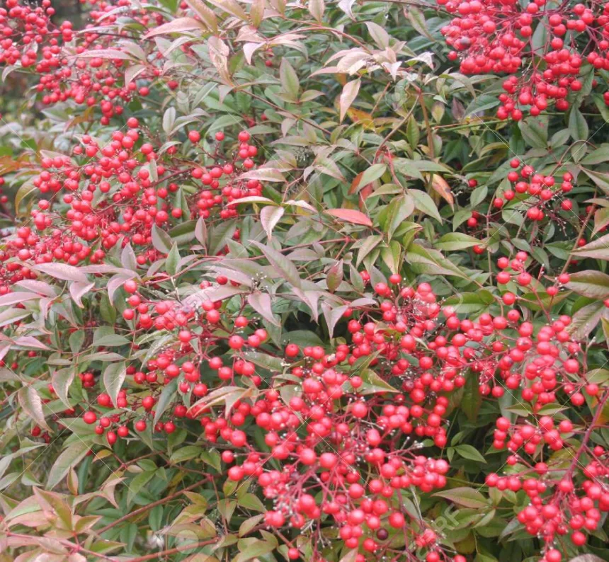 Nandina domestica, sometimes called Heavenly Bamboo, is an oriental shrub. Often located near the doors of Japanese homes, it is a good luck symbol that is supposed to mediate family disputes. With its white blooms in May and spectacular red berries from fall to winter, the Nandina can show varying colors year-round.