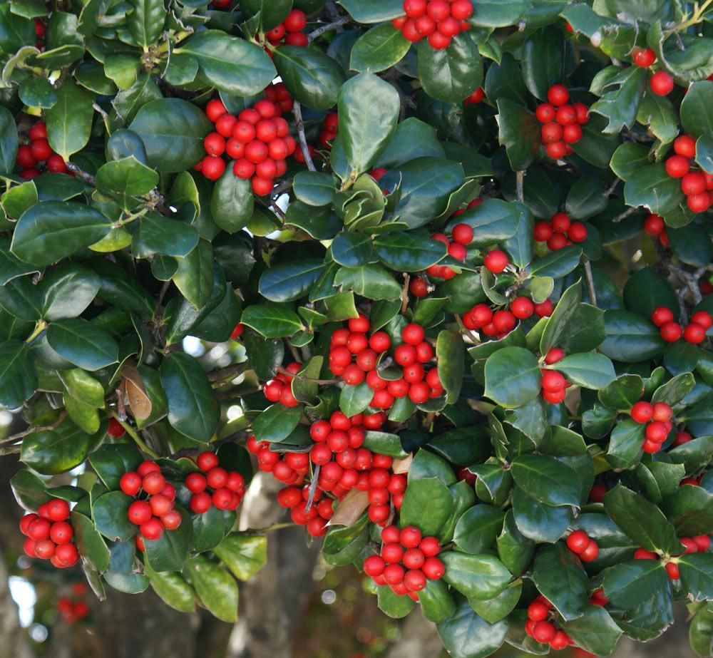 Ilex opaca, American Holly, is a medium-sized native evergreen tree. The tree bears inconspicuous flowers, with only the female tree able to produce berries. The fruit begins to turn red in the fall and persists into the winter.