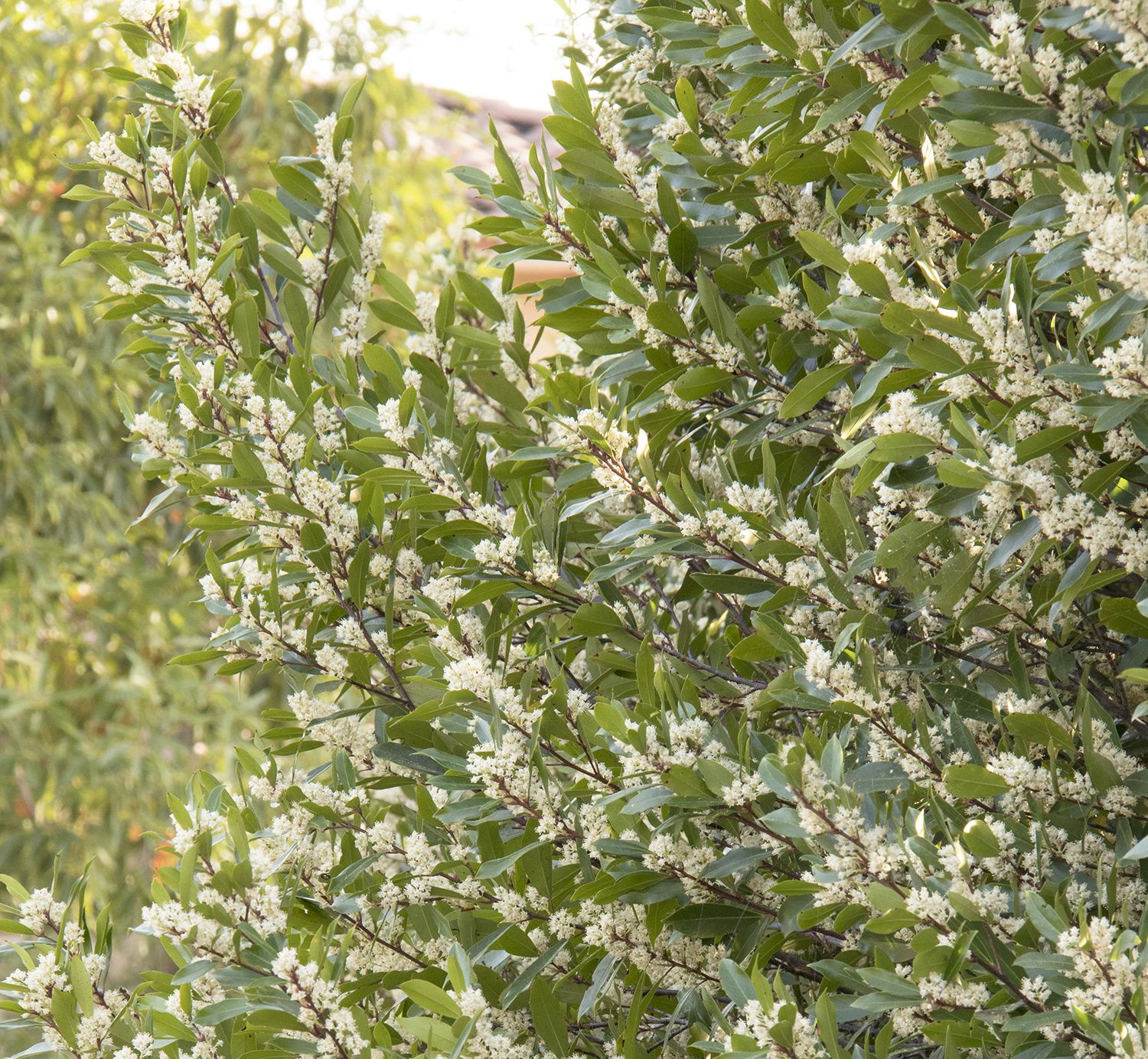 Prunus caroliniana is a small, native evergreen tree. The plant bears prolific clusters of small, white flowers in April followed by black berries that are popular with a variety of birds.