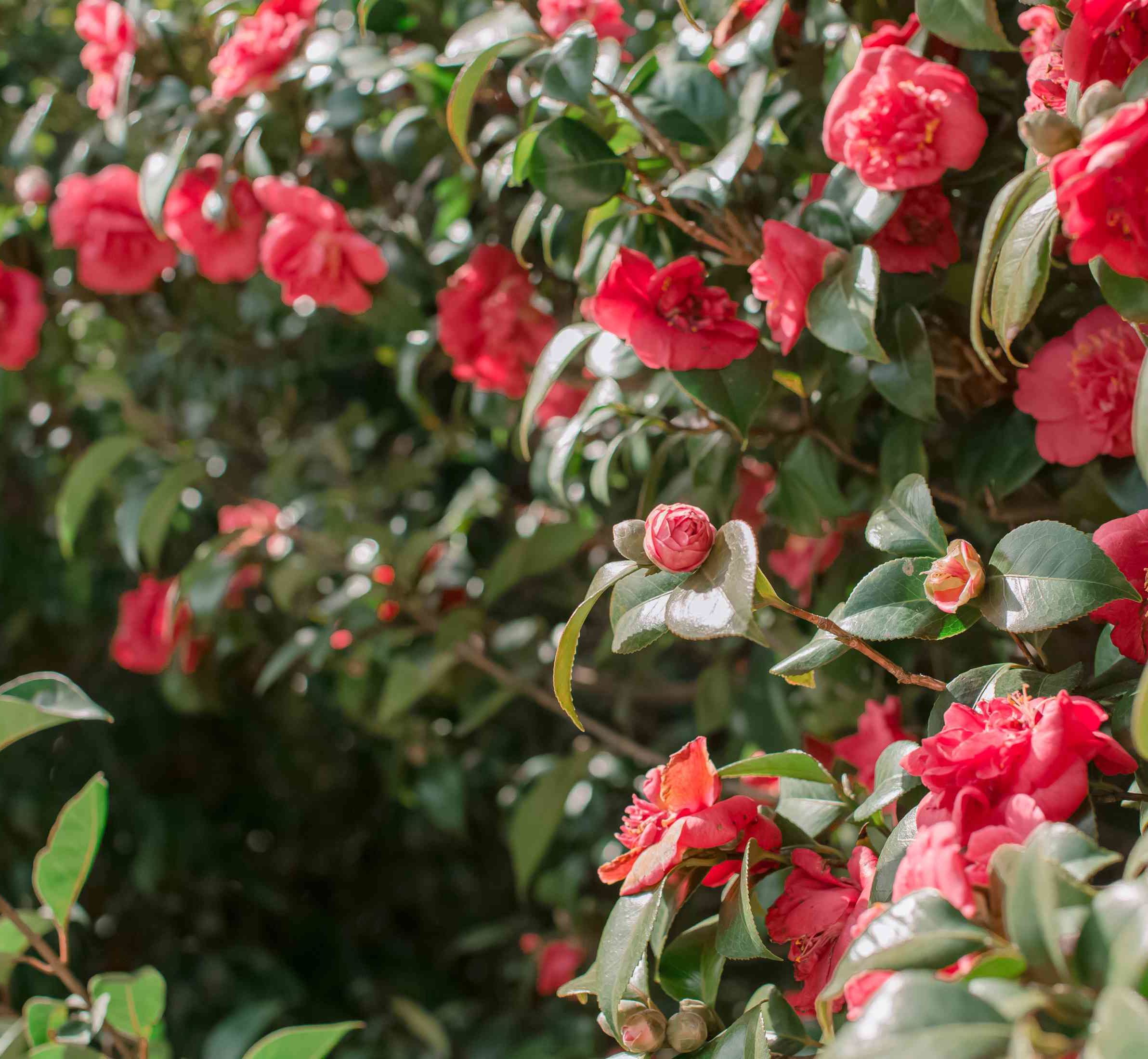Camellia japonica is a classic flowering evergreen shrub belonging to the Tea Family, and is native to China and Japan. The Berckmans family, who ran a nursery on the property prior to the construction of Augusta National, imported plants from Japan, France, England, Germany and Belgium, and listed 24 named varieties in P. J. A. Berckmans' catalogue of 1861. Blooming period and color vary depending on variety. Both the japonica and sasanqua species abound on this hole.