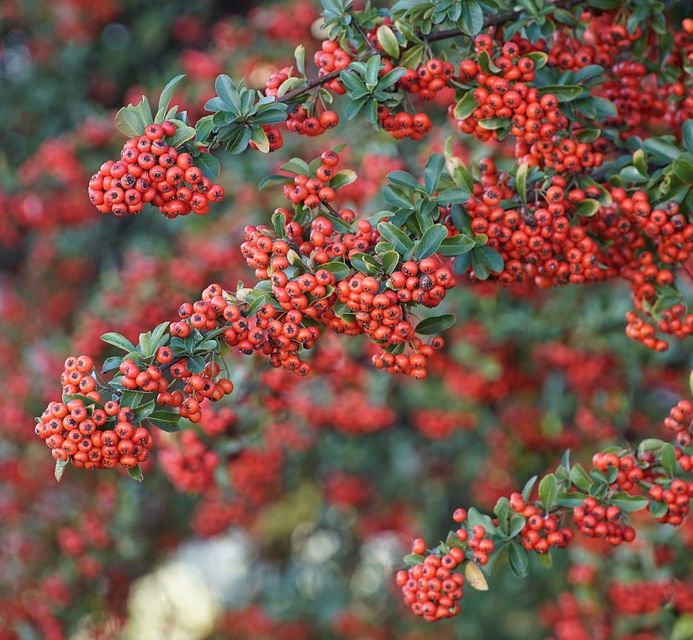 Pyracantha coccinea is one of the most prolific bearers of orange-red berries. It belongs to the Rose family, and in April is covered with numerous small, creamy-white flowers, which in turn form the brilliant berries. The name Firethorn comes from the multitude of thorns covering the branches. The shrub is native to southern Europe.