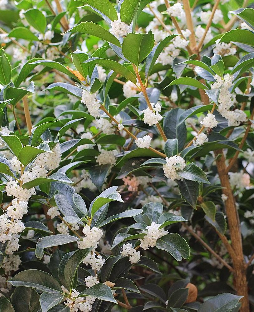 Osmanthus fragrans, native to southern Asia, is an evergreen shrub or small tree belonging to the Olive Family. Its intermittent displays of small white flowers from December to March are delightfully fragrant. The Tea Olive attains a height of 16 to 20 feet and works well for hedges and screens, or as a landscape specimen. A great choice for along walks and near entrances where the fragrance can be fully enjoyed.