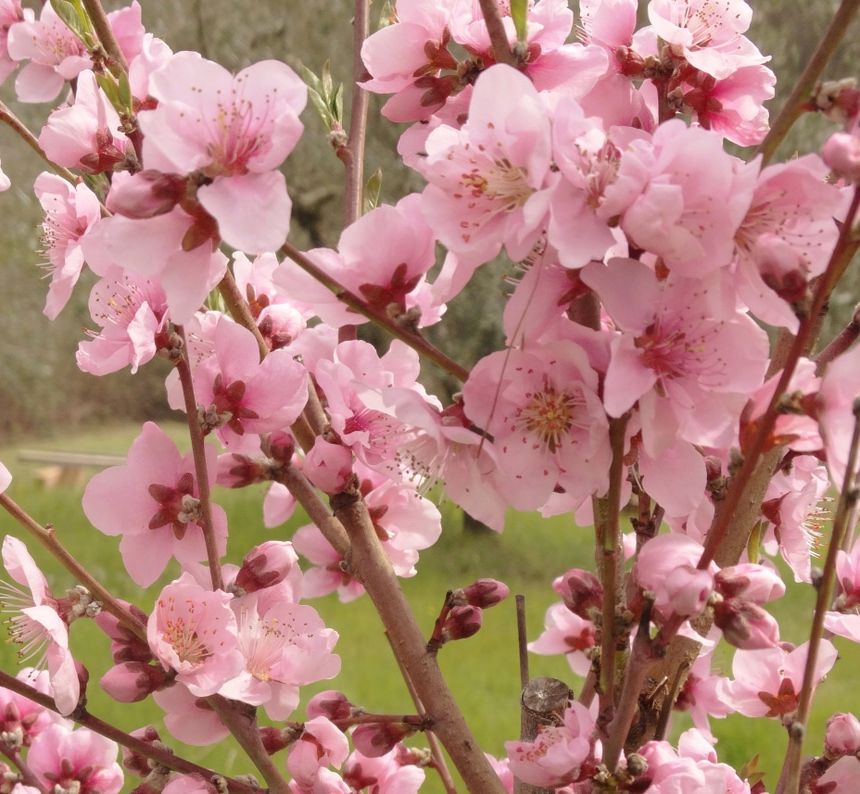 Prunus persica is native to China. The flowering varieties are cultivars developed for their showy blossoms and not their fruit. The flowers may come in white, pink, red or variegated colors; they usually bloom from mid- to late March.