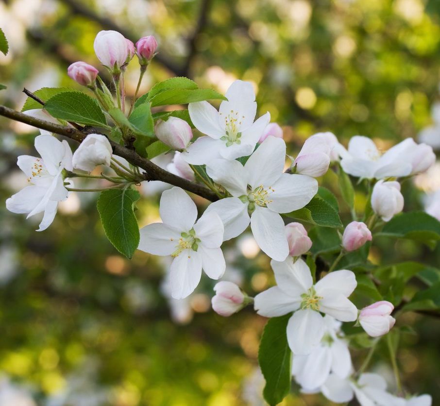 These flowering crab apples, Malus hybrida, are Far Eastern varieties that have a more prolific flowering habit than native forms. The trees bloom in late March and early April, with light-pink to deep-rose flowers followed in the fall by colorful tiny apples, a popular food for wild birds.