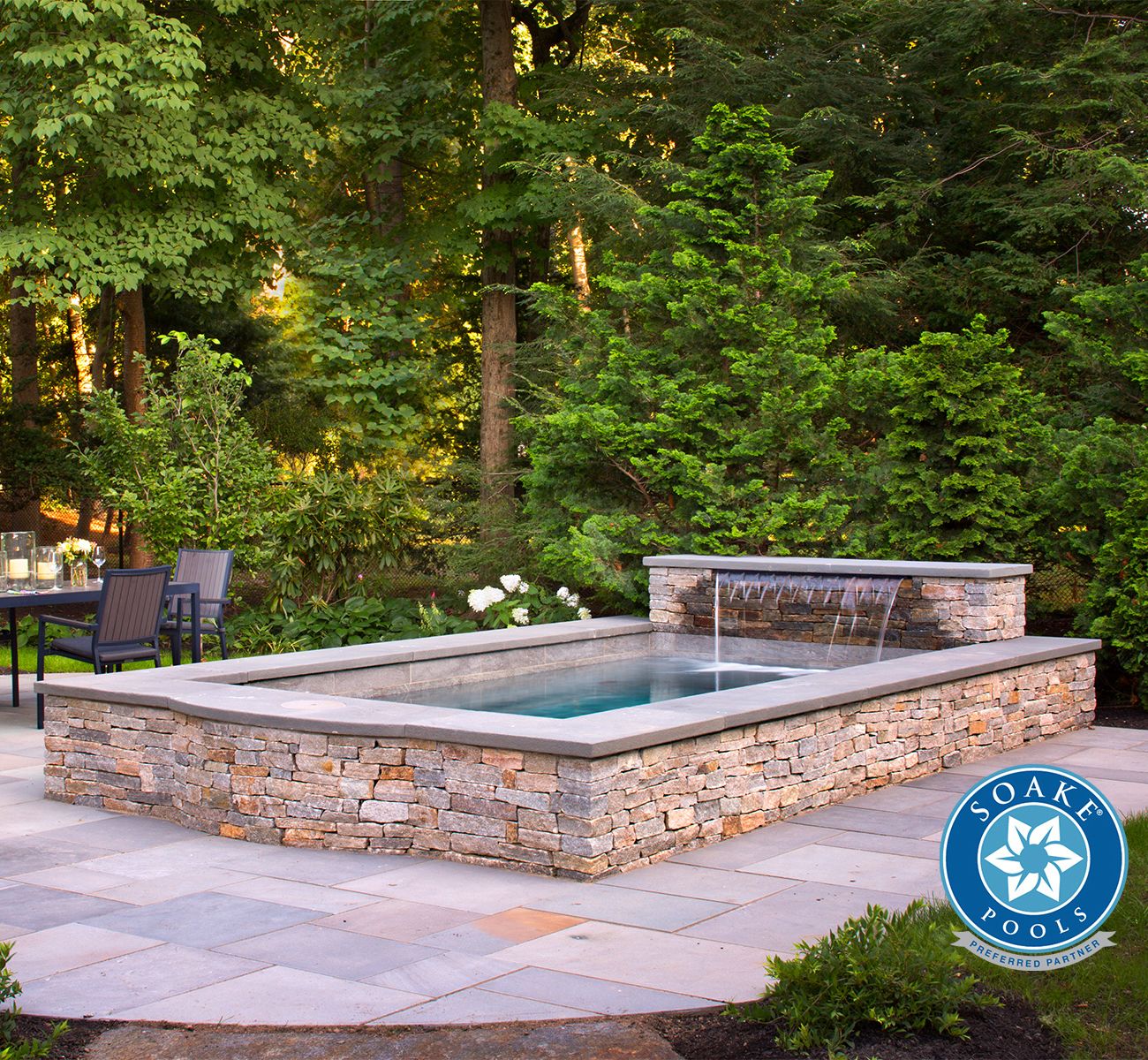 Our plunge pools typically start with the innovative structures from Soake pools. Their plunge pools are made in New England using state-of-the-art materials and delivered pre-built for a quick installation. Soake pools offers 4 linear models ranging from 7' x 7' to 7' x 13'. Upgrades include a static-swim system to create a lap-pool current and a heater/insulation package for year-round use. Their unique structures can be installed flush with the ground or raised (as pictured) to create a unique and stunning feature.