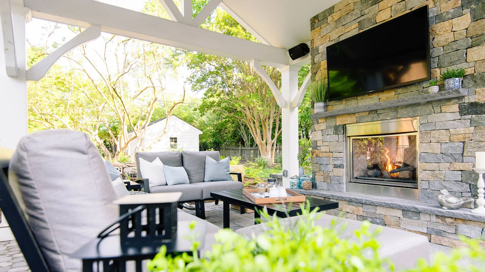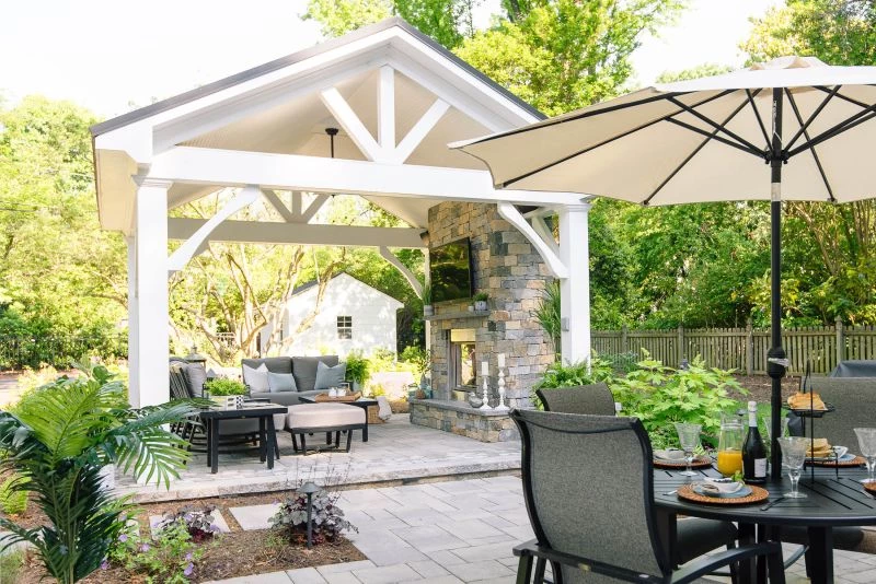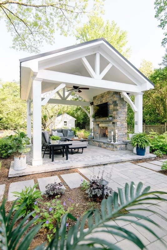 The design features numerous exciting elements including a pavilion-covered patio, gas fireplace, outdoor TV and audio, water feature, stepping stone walkway, driveway with parking area, custom shed, powder-coated aluminum fence, and a new landscape that completes the relaxing and natural atmosphere. Without question, the resulting space is true backyard transformation.