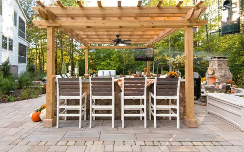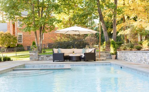 During the hot summer months, even the most sun-loving individuals need the occasional break from the heat. Though it doesn't actually lower the temperature, science shows that shade makes the air feel 10-15 degrees cooler. Wheather covering an outdoor kitchen or providing a shaded sitting area, consider adding a pergola or pavilion to your poolscape.