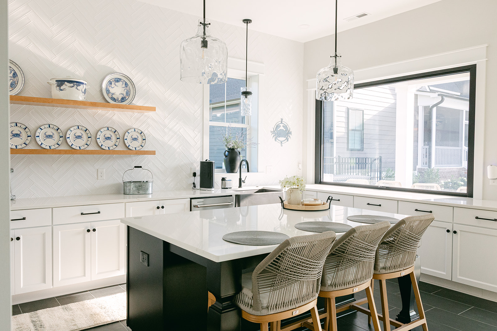 A particularly personal touch is the custom bourbon nook, designed to showcase the homeowner’s collection. With built-in shelving and intentional lighting, this feature turns a passion into a design statement, infusing the space with character and charm.