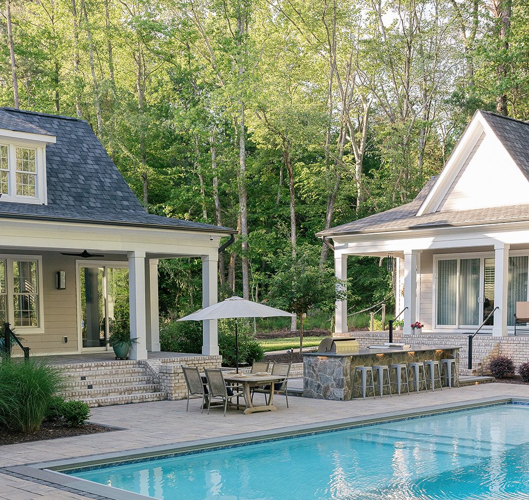 The design process moved quickly, unfolding in just two rounds of fully estimated drawings thanks to the homeowners’ clear vision for layout and budget. With most materials selected to match the home’s exterior, the design focus centered on the pool plaster and tile, along with a few pool house finishes where the homeowners opted for a fresh departure from their interior palette.