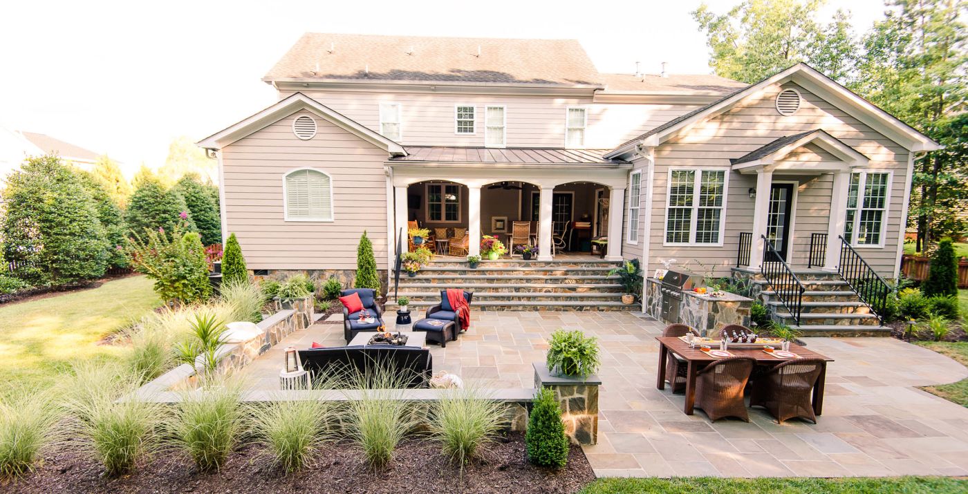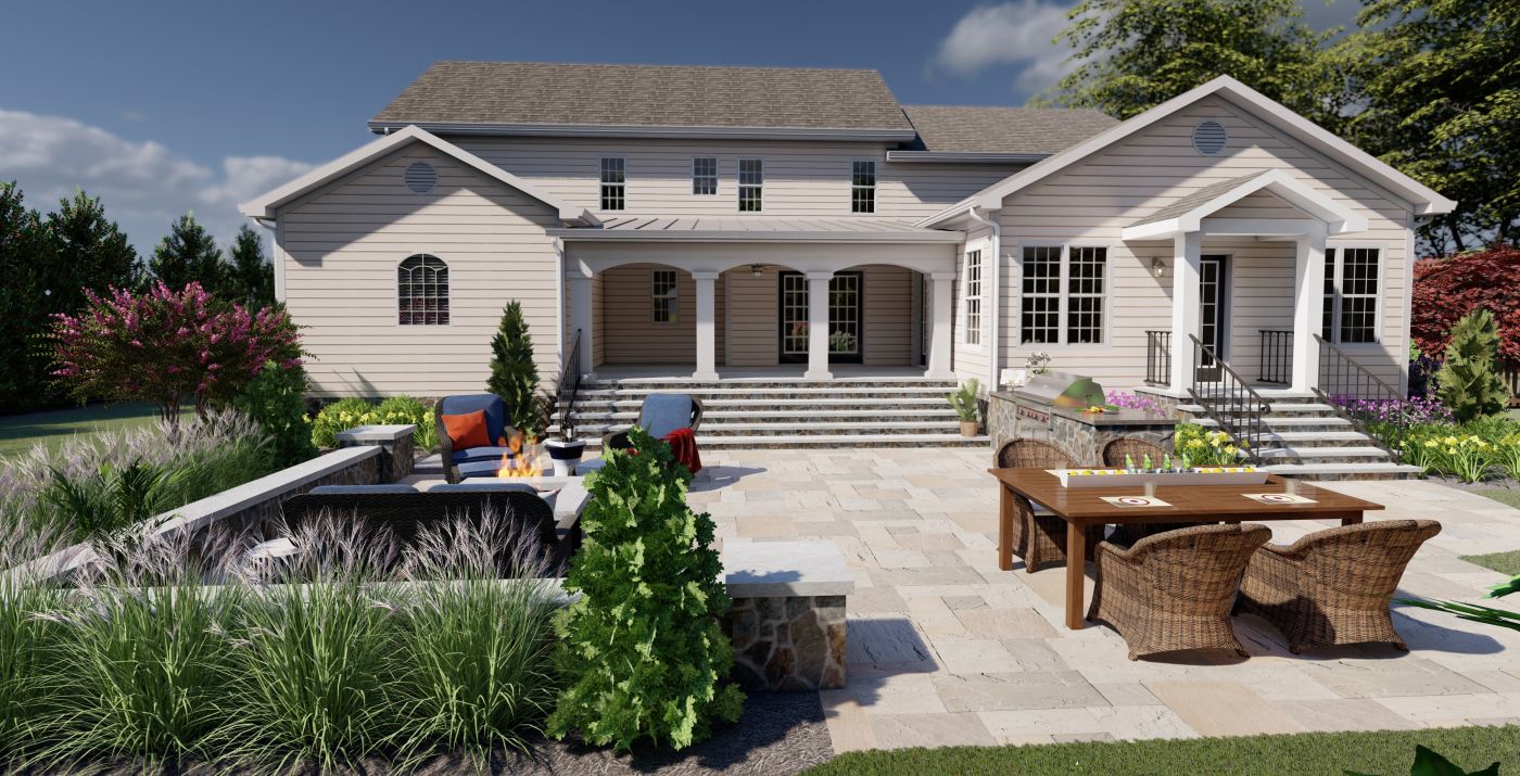 With their kids grown and out of the house, this hardworking couple was looking to transform their blank backyard into something special. Before undertaking the project, the couple's home had a beautiful covered porch, but the backyard featured little else. The goal of this project was to utilize the blank backyard to create a spacious outdoor room that built upon and incorporated the existing porch.
