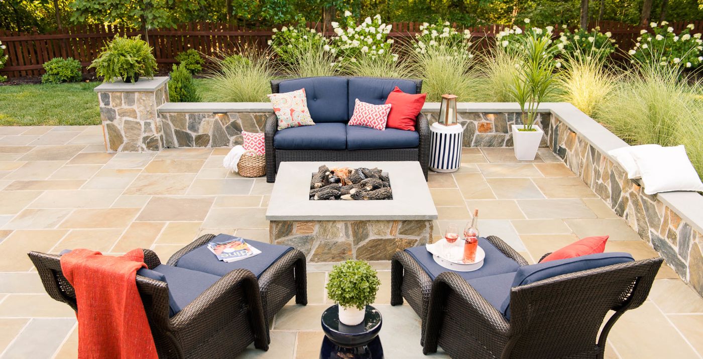 The final space is a stunning extension of the house and features a mortared-bluestone patio, grill island, gas fire pit, sitting walls and outdoor lighting. The project also includes comprehensive landscaping of the front and backyard.