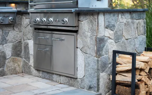 This outdoor kitchen features a chocolate grey thin stone veneer.
