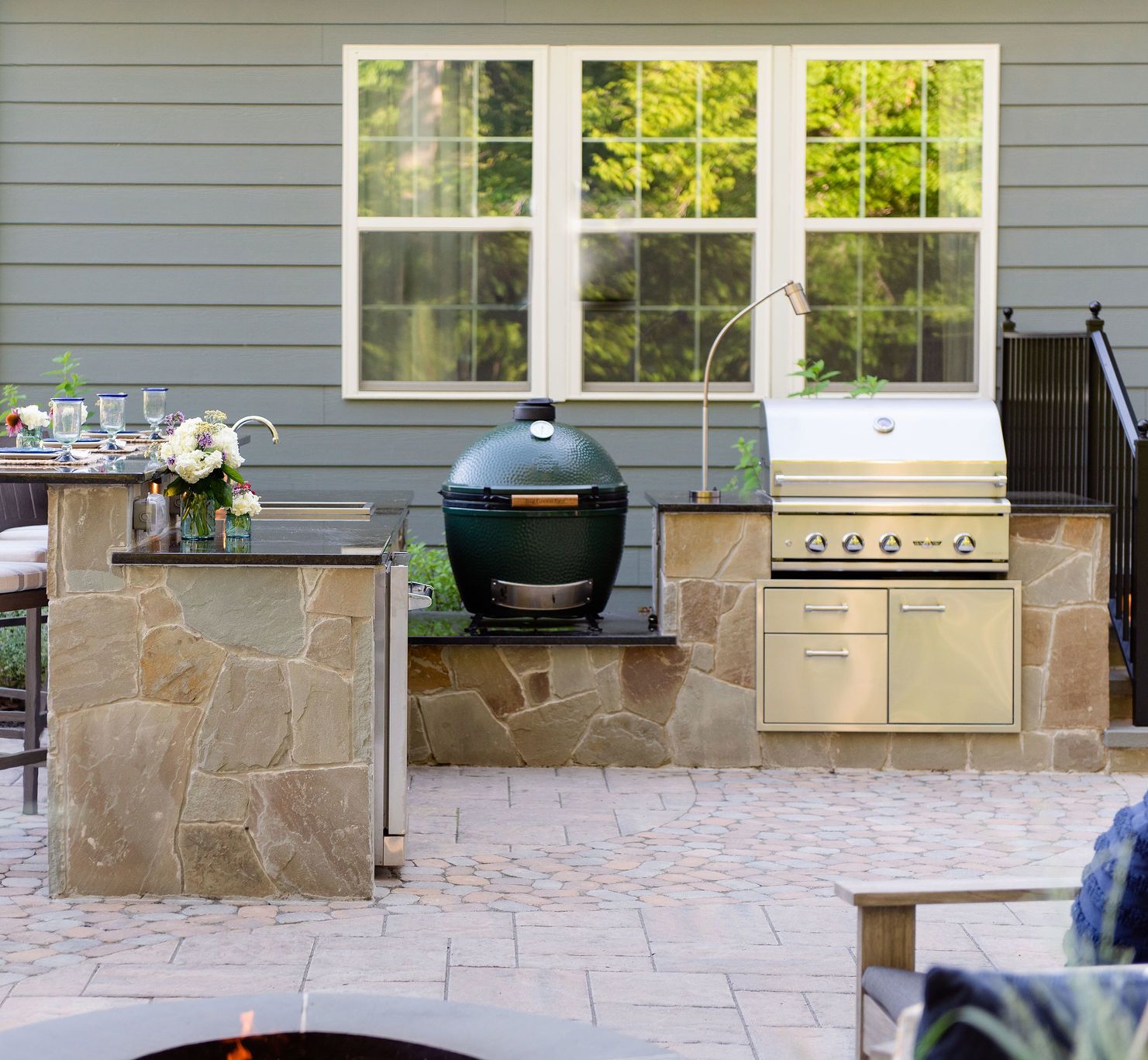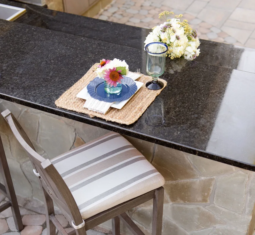 At Outdoor Dreams, we believe the best choices for outdoor counters are granite and marble. These stones are durable and require little maintenance because they typically come treated to prevent staining. Other natural stone slabs (like bluestone, limestone, or sandstone) can be used, but they require regular application of sealants to prevent stains from cooking and mother nature.