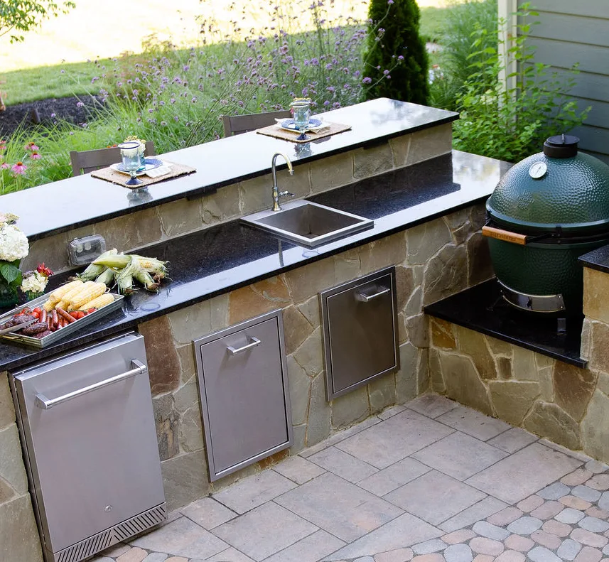 When you're dealing with sauces, marinades, and raw meats, it's great to have a sink nearby to wash your hands. That being said, sinks aren't regularly included in outdoor kitchens because of the plumbing costs associated with the feature. To meet code and pass inspection, sinks must have a return to the sewage line, which is often a costly venture in outdoor kitchens. Though the sink and access door (also required by code) typically cost less than $1,500, the plumbing fees associated with outdoor kitchen sinks can range from $2,000 - $8,000+.