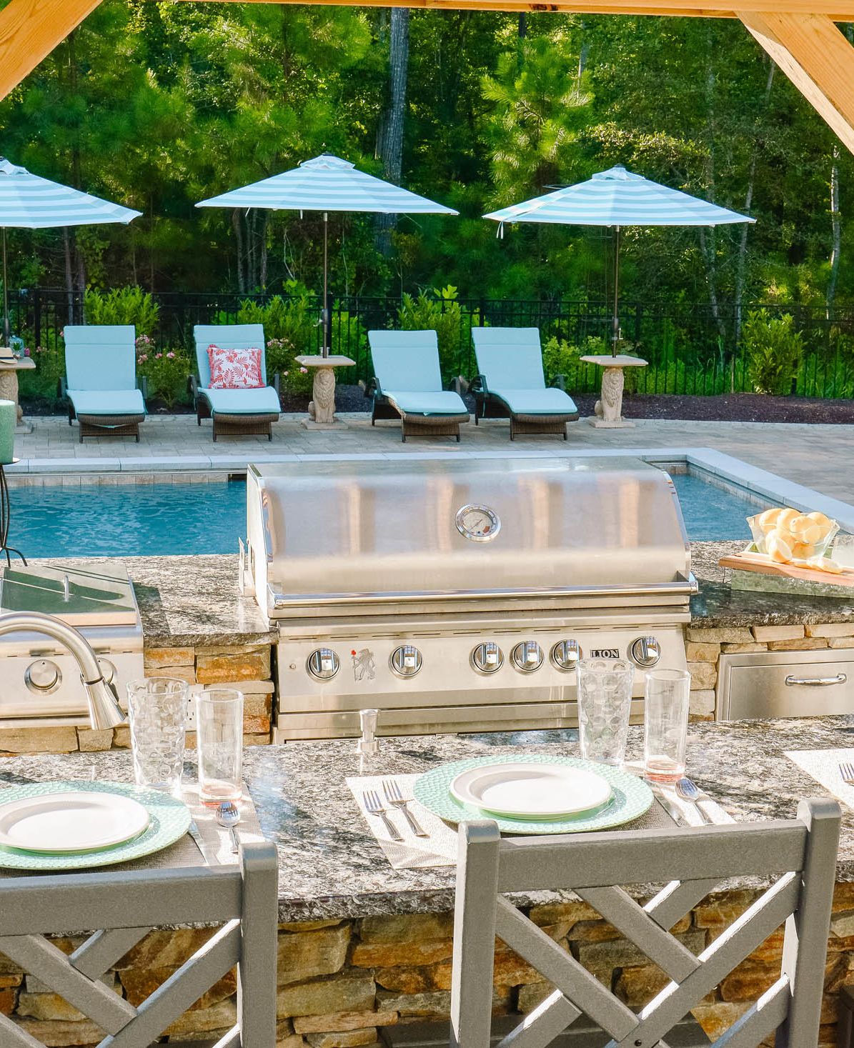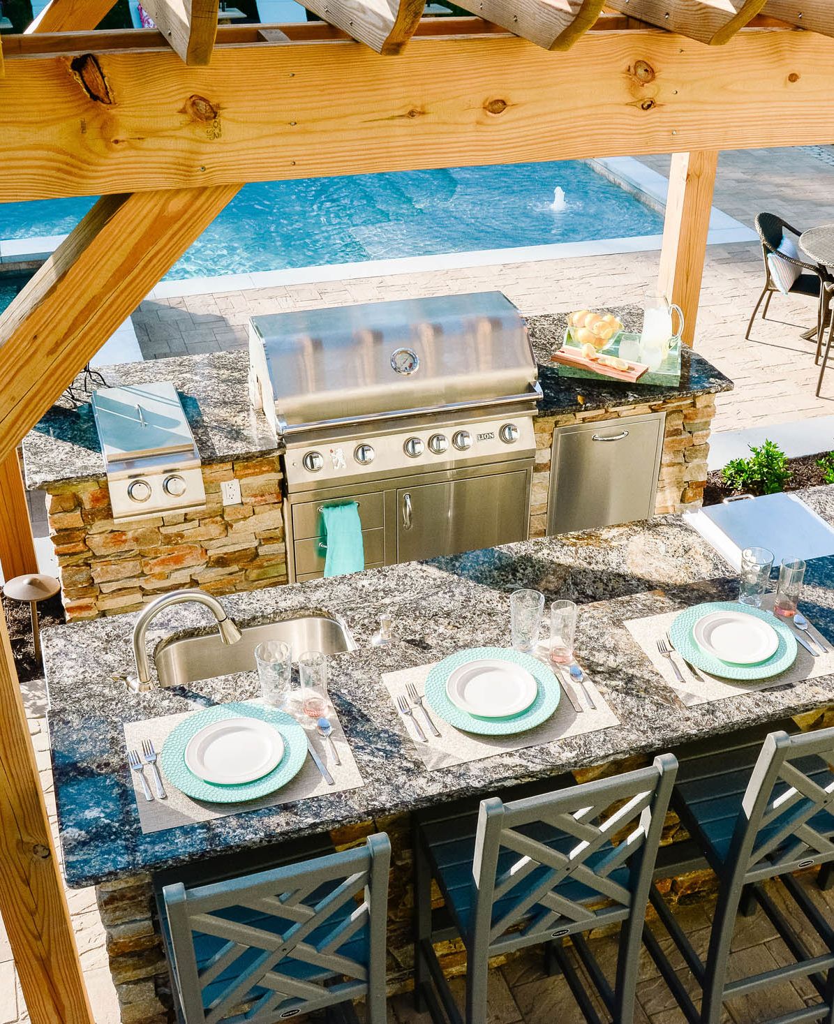 When designing your outdoor kitchen, don't forget to think through the views of everyone enjoying the feature. For example, many poolscapes feature outdoor kitchens designed to provide a view of the pool. If an outdoor television is being included, design the outdoor kitchen so that individuals do not have their back to the tv or have to turn their heads sharply/uncomfortably.